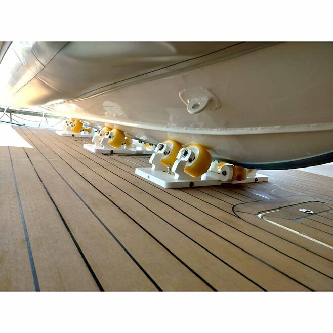 VersaChock’s Four Roller Kitassists loading watercraft onto swim platforms and docks. It is designed for use with VersaChock brand edge roller kit (VCROLLER25). Four, large 5″, self-adjusting poly rollers conform to hull shapes from 0 to 24 degree deadrise.